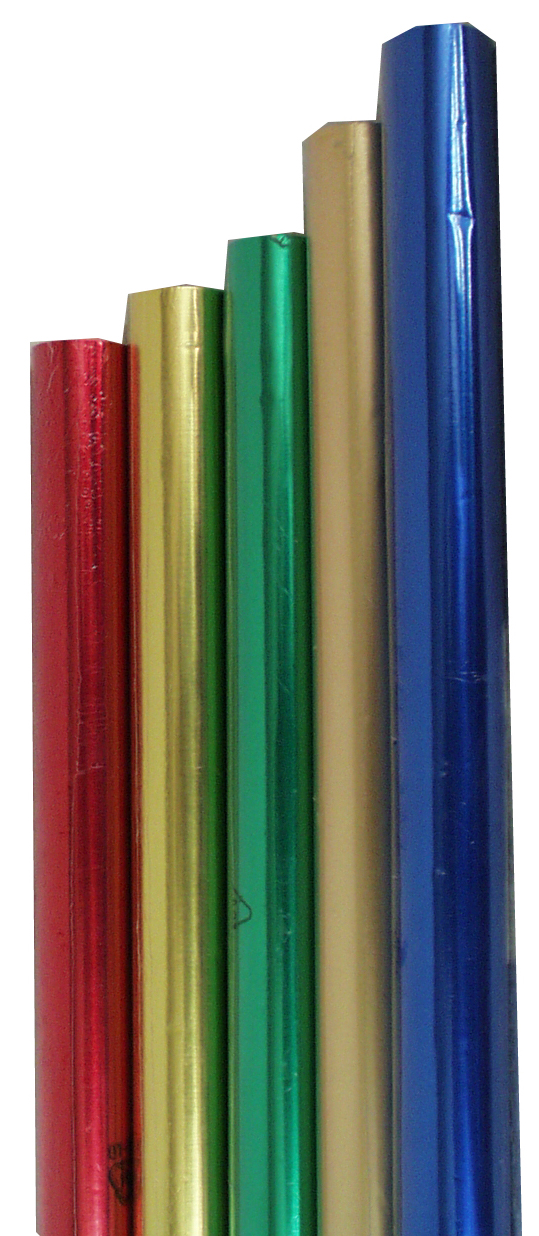 Metallfolie zweiseitig kaschiert, auf Rollen, 10m lang und 50cm breit, in den Farben: gold/gold, silber/gold, silber/blau, gold/rot gold/grün, gold/blau, rot/rot, grün/grün, blau/blau, violett/gold und pink/gold